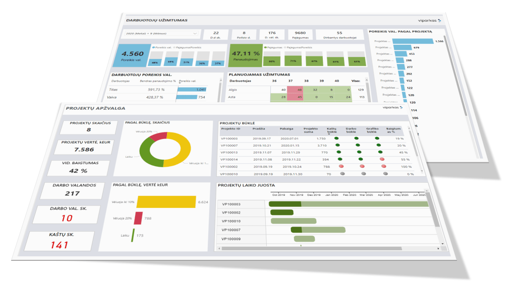 Pagrindinių veiklos rodiklių ataskaitos apjungia atskiras rodiklių, faktinių bei planinių duomenų vizualizacijas į gerai organizuotą vieno puslapio pateiktį.