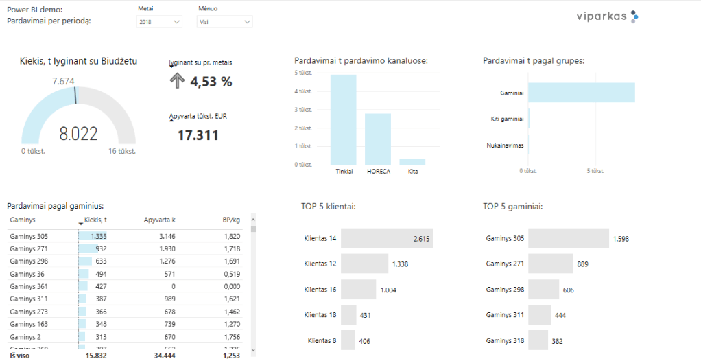 Power BI pagalba sujungiami duomenys iš įvairiausių šaltinių (apskaitos, verslo valdymo sistemų, Excel, web, pan.), automatizuojamas jų parengimas naudojimui bei sukuriamos pardavimų ataskaitos, kuriose yra visa, sprendimų priėmimui reikalinga informacija.