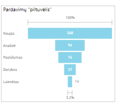 Pardavimų “piltuvėlio“ vizuali analizė padeda pardavimų komandai laiku pamatyti kur reikalingiausia sutelkti pastangas, kur labiausiai “stringa“ procesas, ar kuris nors pardavimų komandos narys, taip pat prognozuoti kokių rezultatų tikėtis artimiausioje ateityje.