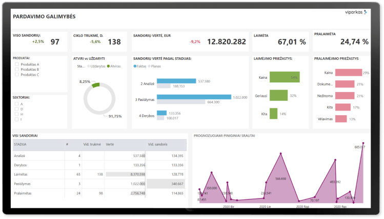 Pardavimo proceso ataskaitos gali būti pačiose verslo valdymo ar CRM sistemose, arba sukurtos Excel ar tikrų verslo analitikos įrankių pagalba.