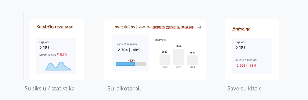 Verslo duomenų pateiktyse šalia duomenų, rodiklių, diagramų yra filtrai, antraštės, palyginamieji duomenys paaiškinantys kas vaizduojame, kokiame laikotarpyje tai vyko, su kuo duomenys yra susiję.