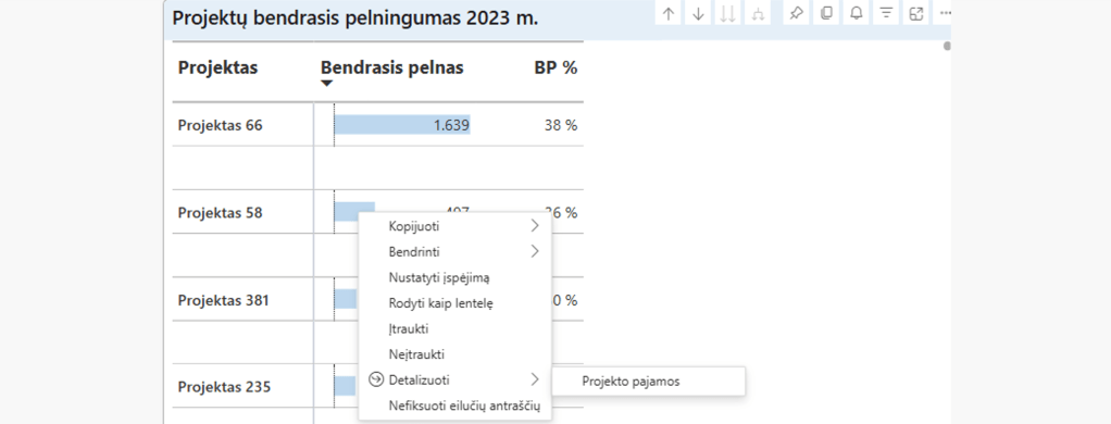 Jei tokia galimybė yra – paspaudus dešinį pelės klavišą reikšmių srityje bus meniu punktas Detalizuoti (angl. Drill-through) ir vienas arba keli detalizavimo ataskaitų pasirinkimai.