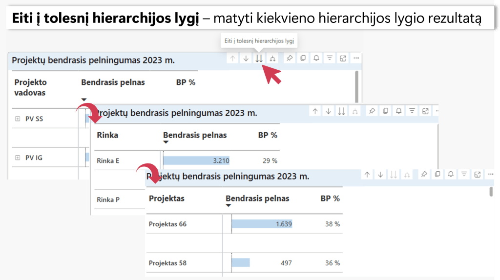 Trečioji ikona “Eiti į tolesnį hierarchijos lygį“ leidžia matyti agreguotus kiekvieno hierarchijos lygio rezultatus, t.y. matyti bendrąjį pelną pagal projekto vadovą, pagal rinką arba pagal projektą.