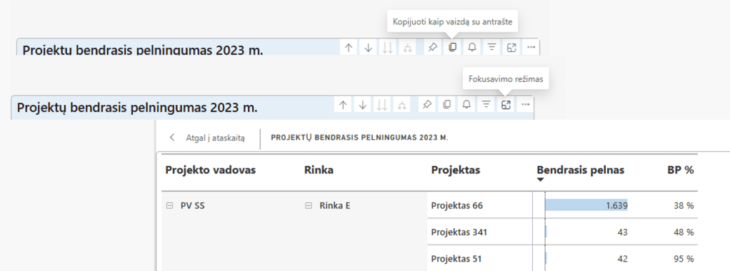 O “Fokusavimo režimas“ naudingas norint sutelkti dėmesį į konkrečią vizualizaciją, nes atidaro lentelę ar diagramą atskirame lange, kur galima sutelkti dėmesį į detales.