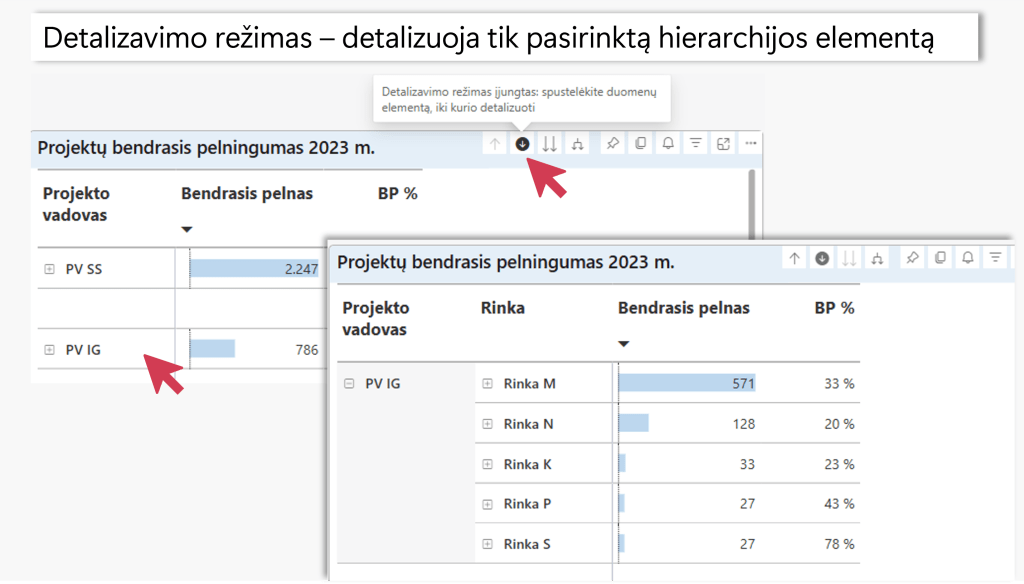 Power BI duomenų lentelėje arba diagramoje jos kūrėjai galėjo suprojektuoti detalizavimo galimybę.
