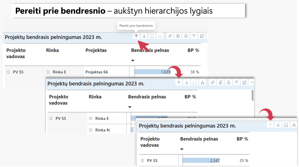 Žemiausiame hierarchijos lygmenyje (pagal Projekto lygį šiame pavyzdyje), spaudžiant pirmąją “Pereiti prie bendresnio“ ikoną galima kilti aukštyn hierarchijos lygiais ir matyti agreguotus duomenis.
