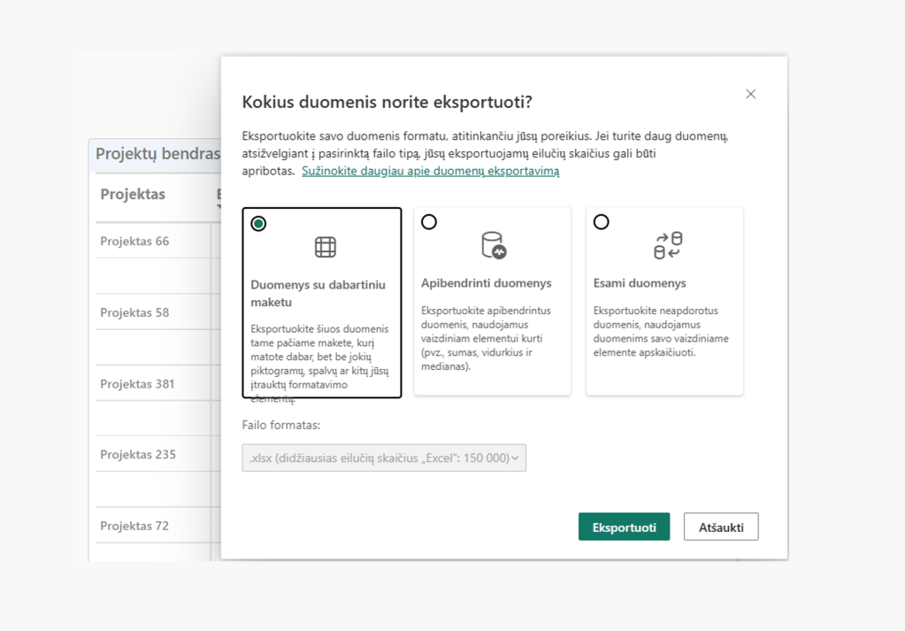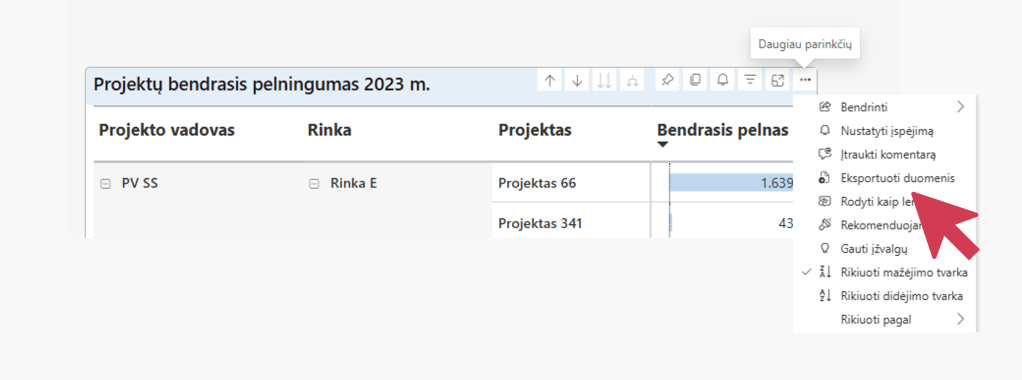 Viena iš dažniausiai naudojamų Power BI parinkčių yra galimybė eksportuoti duomenų lentelės, diagramos ar kitos vizualizacijos duomenis į Excel.