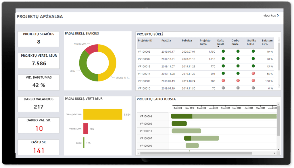 Kokia projektų būklė šiuo metu? Kurie projektai atsilieka nuo grafiko? Kurie viršija kaštus? Kokie planuotų ir faktinių rezultatų skirtumai?