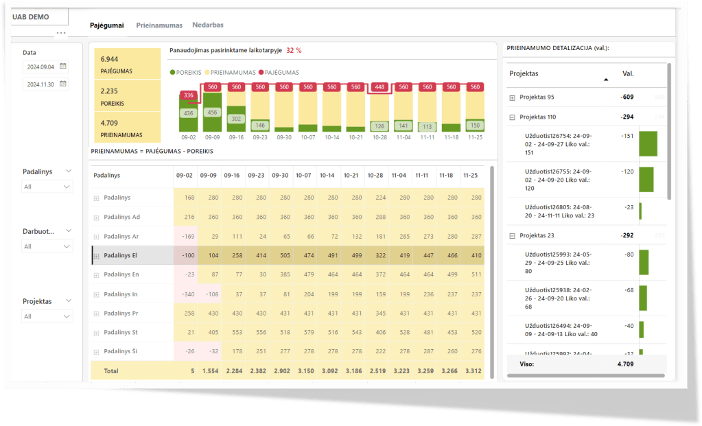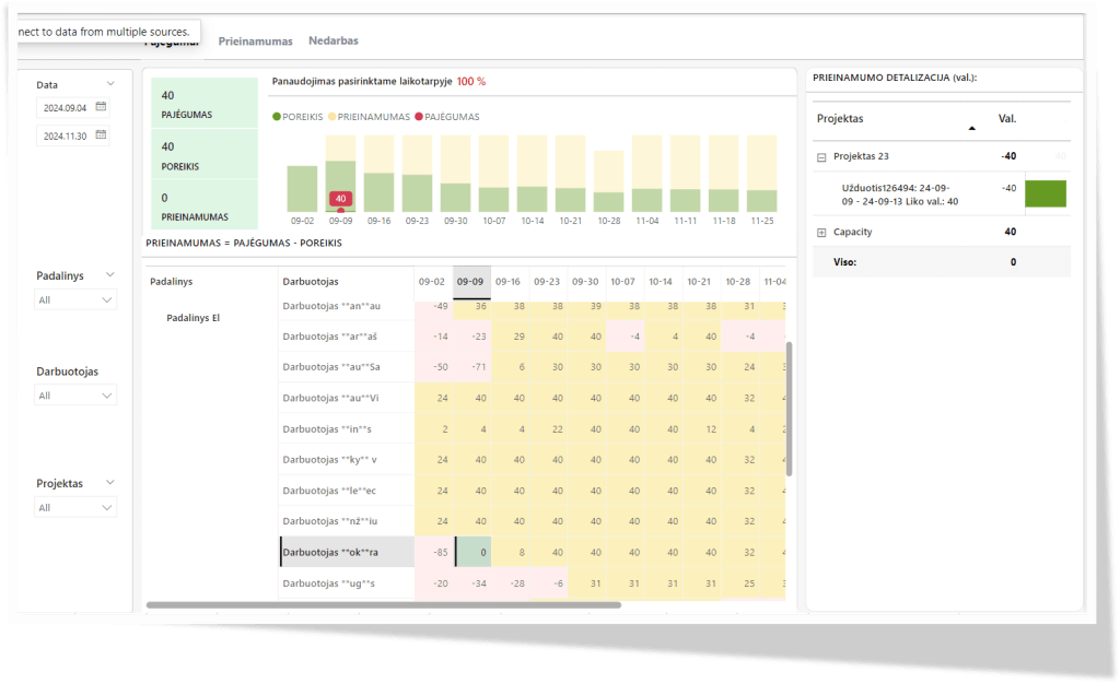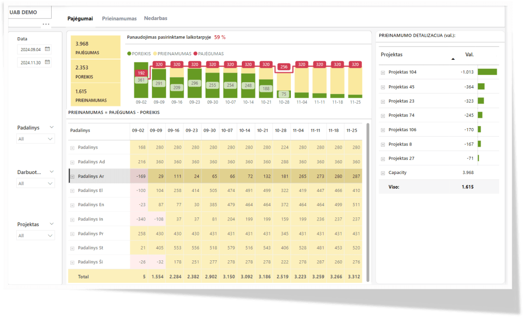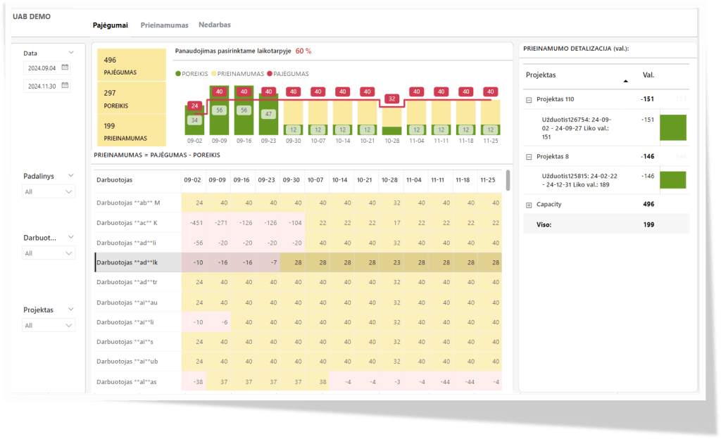 Prieinamas valandas lyginant su tikėtinu valandų poreikiu projektų veiklose, matoma ar pasirinktame laikotarpyje darbuotojas yra perkrautas, ar atvirkščiai – neturi pakankamo užimtumo.