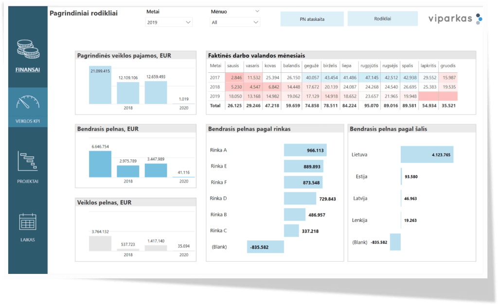 - Pardavimus įvairiais pjūviais: pagal kanalus, šalis, produktus, vadybininkus, regionus ir pan.